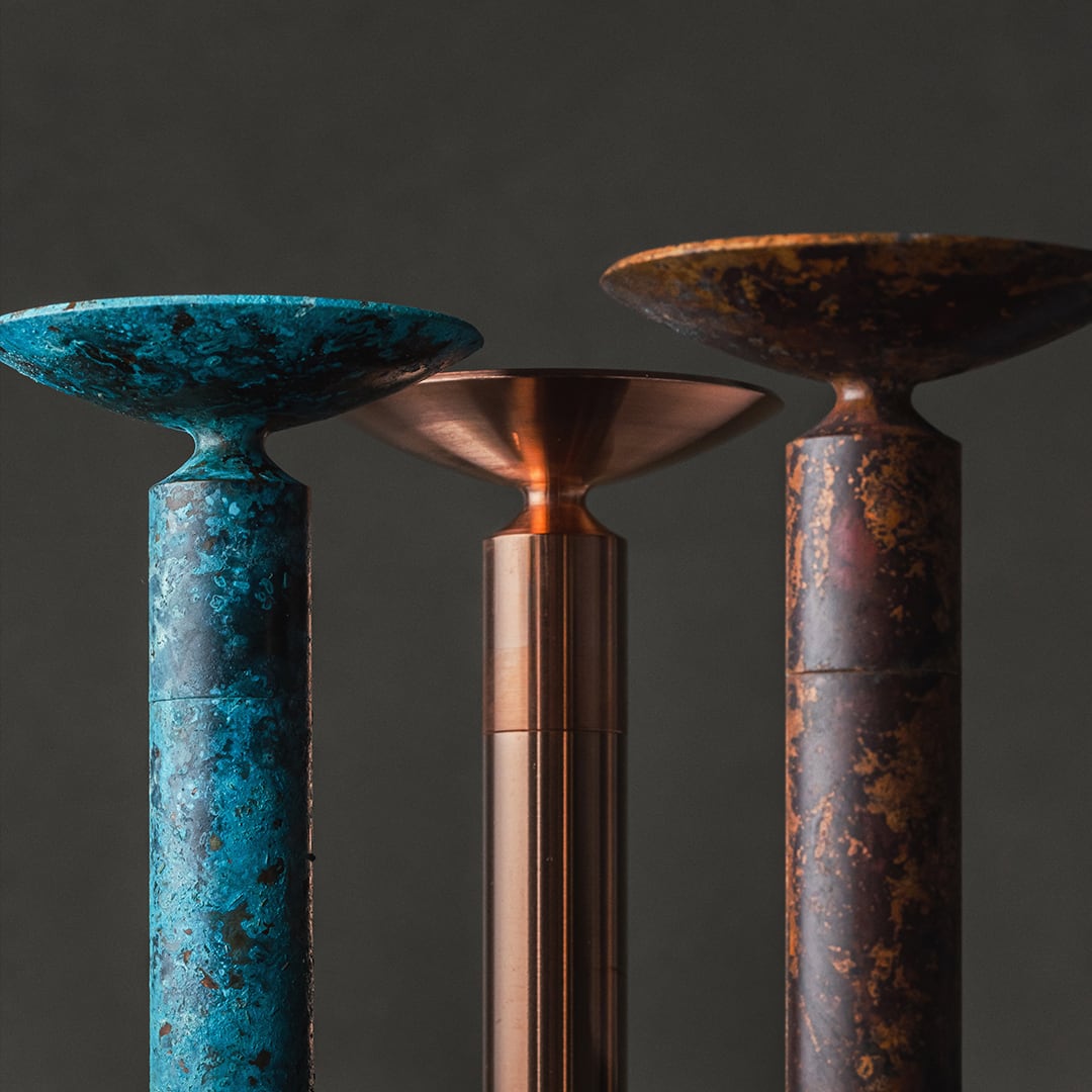 Solid copper, precisely milled and finished in collaboration with an artist specializing in metal patination, is adorned with verdigris.